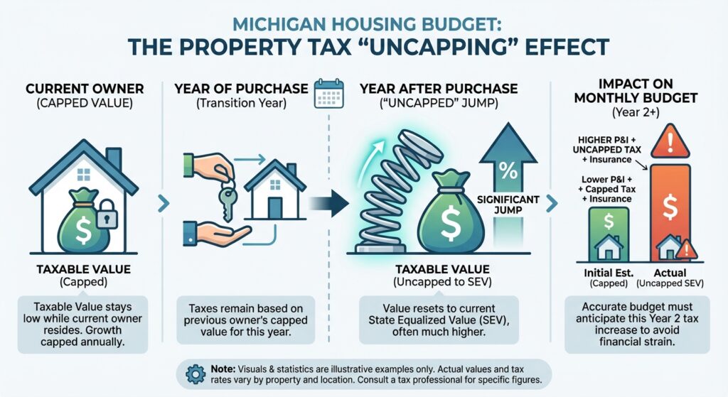 - The Uncapping of Property Taxes: Under Michigan law, a property’s taxable value is capped while the current owner lives there. However, the year after you purchase the home, the taxable value uncaps and adjusts to the current State Equalized Value (SEV). This can cause a significant jump in your tax bill that standard calculators miss completely.